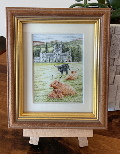 This latest piece was inspired by a recent trip to Balmoral in the spring. I had been asked to produce a card featuring the kirk where the Royals visit when staying at the estate. This is my interpretation, with a bit of wildlife of course!